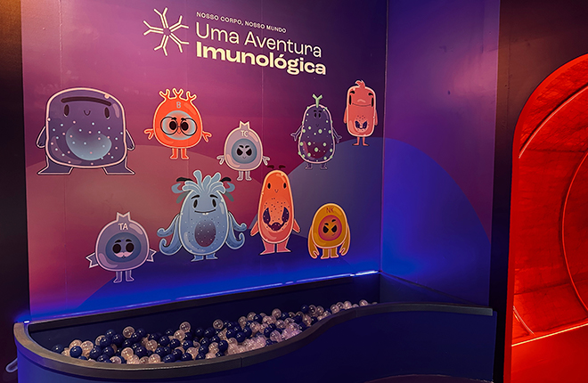 Distribuída em 225m², a mostra ensina de forma didática, lúdica e interativa os principais mecanismos de defesa do organismo e destaca o papel fundamental do sistema imunológico na proteção contra vírus, bactérias e outros invasores. Com uma abordagem divertida, ao longo do percurso da exposição, o público recebe informações sobre saúde, ciência e autocuidado por meio de jogos, vídeos e instalações sensoriais.