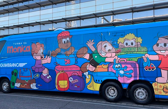 A companhia já conta com o primeiro veículo temático do Chico Bento, lançado em janeiro como parte de um projeto cultural que passou a circular nas linhas operadas pela Águia Branca. Agora, o novo ônibus da Turma da Mônica – um modelo semileito com chassi RSD de 42 lugares – traz estampas icônicas dos personagens infantis da MSP Estúdios. O lançamento aconteceu no último dia 19 de julho, no Parque Villa-Lobos, Zona Oeste de São Paulo.