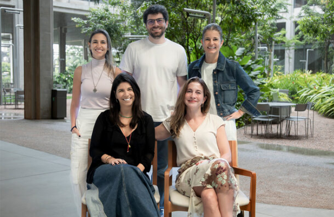 Em pé: Verusca Casciano (head de mídia WMS/Fbiz), Vitor Amos VP de estratégia da Fbiz) e Janaina Luna (head de atendimento da Fbiz). Sentadas: Juliana Romano (head de mídia do QuintoAndar) e Fernanda Tedde (CEO da Fbiz)