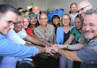 Cidade de Santarém, no Pará, inaugura o Ecocentro da Sociobioeconomia, um polo de bioeconomia onde serão realizadas atividades como a coleta de sementes de andiroba e cupuaçu pela própria comunidade local. O evento de inauguração contou com presenças ilustres, como a Ministra do Meio Ambiente e Mudança do Clima, Marina Silva (centro), e Roberto Matarazzo Braun (esquerda), Presidente da Fundação Toyota do Brasil, que irá promover a qualificação e empoderamento para a comunidade local, em parceria