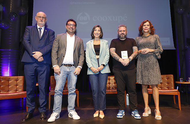 Da esq. para dir.: Luís Antonio Paulino, Roberto Monteiro Jr., Carol Silvestre, Pablo Toledo e Claudia Trevisan participaram da Arena da Inovação da 24ª edição do Congresso Mega Brasil de Comunicação, Inovação e Estratégias Corporativas