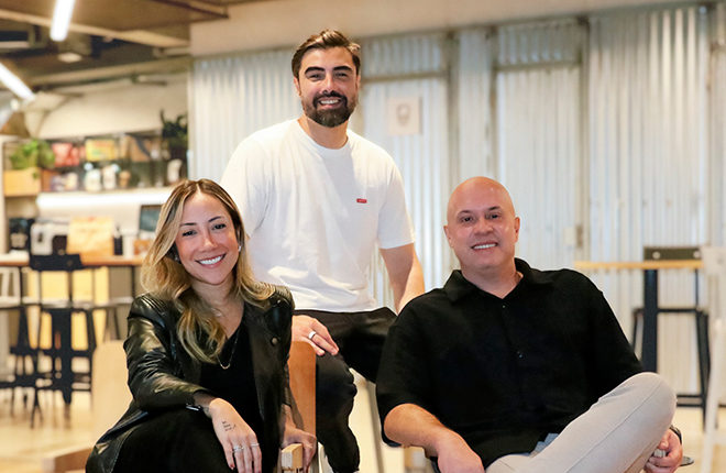 Nancy Sestini, Diretora de Creators da Moshi, ao lado dos sócios fundadores da DOJO, Thiago Baron (centro) e Rodrigo Toledo (direita)