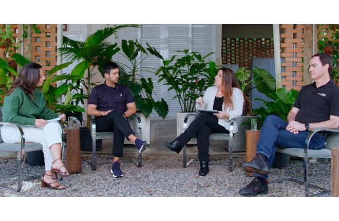 A apresentadora Renata Flores conversa com Mauro Neto (Diretor-Executivo da Votorantim), Fernanda Ferraz (Diretora do Instituto Votorantim) e David Canassa (Diretor da Reservas Votorantim)