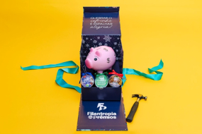 Dentro da caixa, o porquinho de cerâmica simboliza de forma direta o funcionamento da campanha: uma pequena ação pode abrir caminho para grandes resultados. O resultado é um press kit que une simplicidade, clareza e uma experiência envolvente, reforçando a mensagem central da APAE Noel e conectando o público ao propósito da iniciativa.