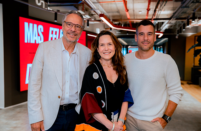 Da esq. para dir.: Antonio Fadiga, Sócio-Presidente da Artplan; Ana Paula Sanchez, Diretora-Geral da Artplan; e Pedro Fernandes, Diretor de Marketing da Baruel